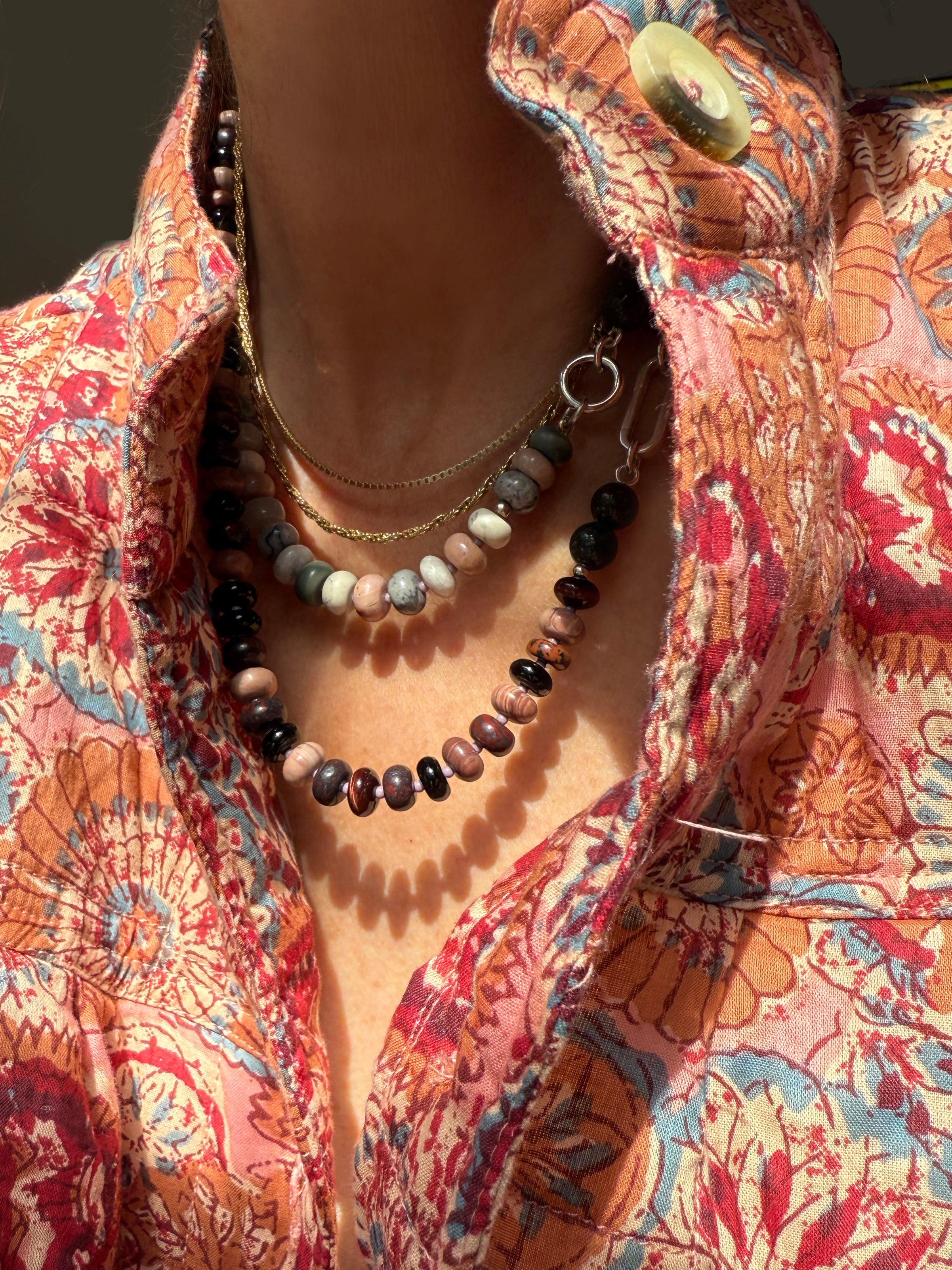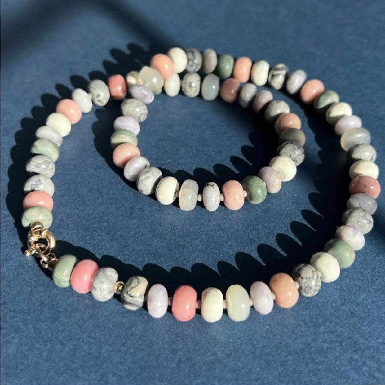 Add a splash of color to your jewelry collection with this one-of-a-kind gemstone necklace! With a vibrant mix of opals, chalcedony, mother of pearl, rhodonite, and quartz gemstone beads. Whether you wear it solo or layer it up with other chains and pendants, it’s the perfect pop of color for any outfit!