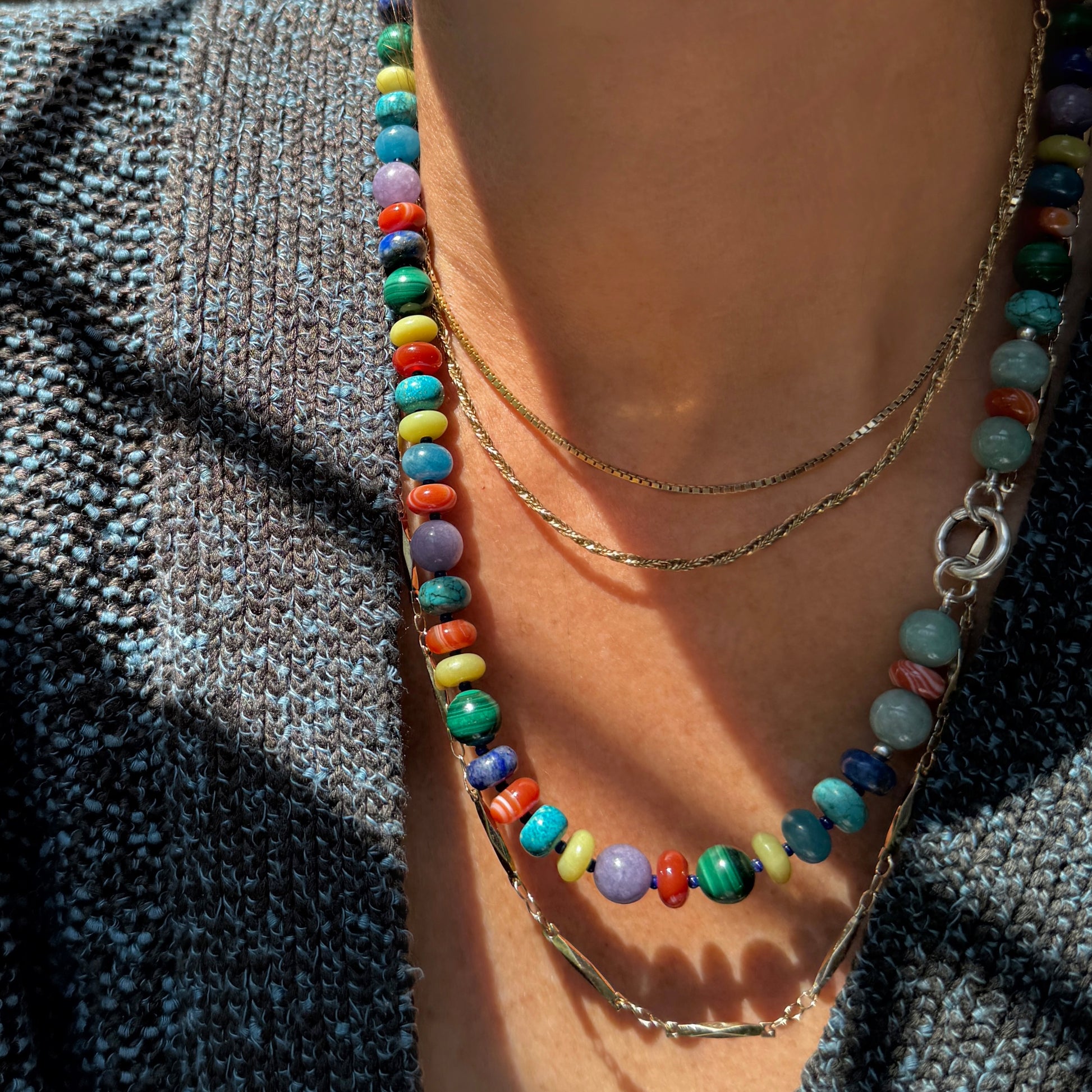 - Hand-selected gemstones: 8x5mm malachite, carnelian, jade, turquoise, lapis luzli, and chalcedony gemstones with fine Czech glass spacers
