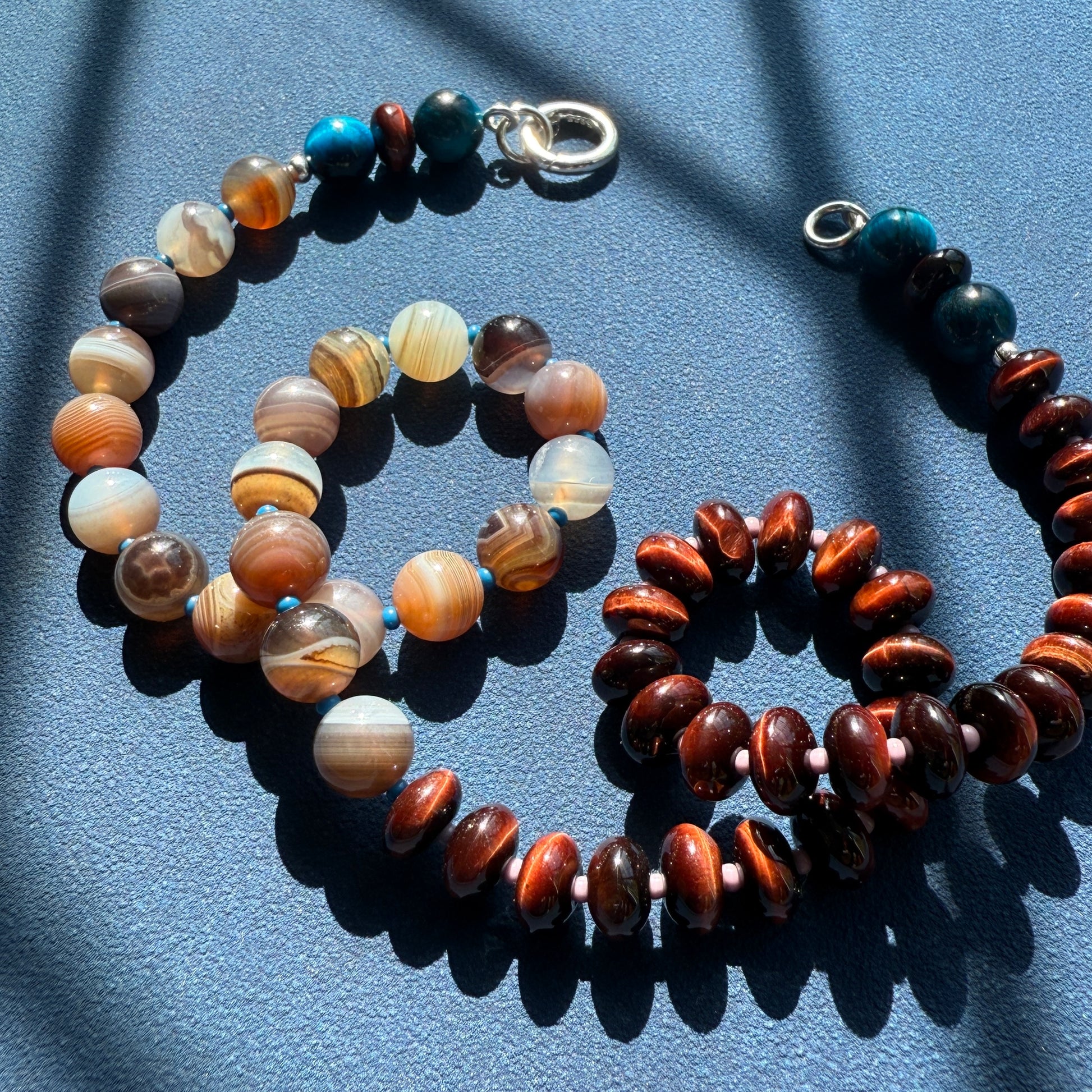 - Hand-selected gemstones: 8mm round Botswana Agate and 5x8mm tiger's eye gemstones with fine Czech glass spacers